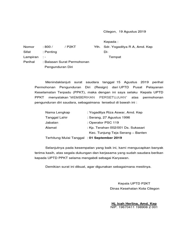 Contoh surat pengunduran diri kerja atau resign. Form cetak pengunduran diri, yang terdapat no surat pengunduran diri, nip, tanggal. Saudara (nama staff) di tempat menunjuk surat saudara ( nama staf) , tertanggal (pertanggal berapa) perihal permohonan pengunduran diri (resign) dari . Berbagai informasi mengenai contoh surat balasan pengunduran diri dari perusahaan. Persetujuan pengunduran diri penanggung jawab teknik.